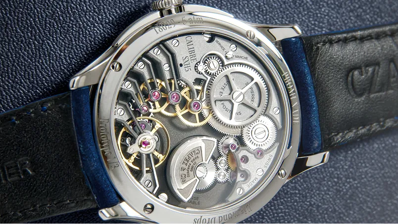 Turn it over and the tone changes from jewellery to watchmaking. Czapek’s in-house calibre SXH5.1 fills the case with a graphic architecture of six skeletonised bridges, a design language drawn from François Czapek’s 19th-century pocket watches. The finishing is confident without being fussy – bevels are clean, sides are straight-grained, inward angles are hand-chamfered – and the platinum micro-rotor, made from recycled metal, keeps the height down while winding a 60-hour reserve. It looks modern, sounds considered and feels like a movement built to be seen.