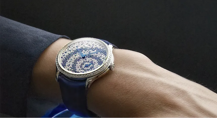 The scene is set by a 38 mm white-gold case with a diamond-set bezel and crown, framing a dial that feels alive when it catches the day. All thanks to the snow-setting technique blanketing the gold base in a mosaic of stones. Diamonds mix with sapphires in shifting blues so the surface looks natural rather than regimented, and the eye reads depth rather than pattern. Many of the stones are tiny – some under half a millimeter – which is why the dial takes days to complete. The ripple motif radiates from the off-centred small seconds at around 4:30, a quiet nod to the earlier Goutte d’Eau watch that imagined a single drop touching still water.