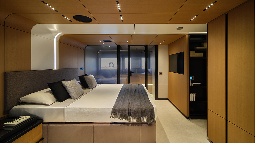 The full-beam owner’s suite sits amidships with a king-sized bed and a large hull window framing the passing seascape. A smart-glass wall separates the ensuite bathroom and turns opaque at the touch of a button. Two additional ensuite cabins – one double, one twin – complete the guest layout, with crew quarters and the galley fully separated forward.